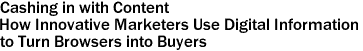design, Scott demonstrates that the key to Web marketing success is compelling content, delivered in new and surprising ways. In Cashing in with Content, he interviews 20 of today’s most innovative Web marketers, sharing their secrets for using content to turn browsers into buyers, to encourage repeat business, and to unleash the amazing power of viral marketing. The book features a diverse range of content-savvy organizations from the worlds of e-commerce, business to- business, and government/not-for-profit, including the Wall Street Journal Online, CARE USA, Kenyon College, Alcoa, Tourism Toronto, Weyerhaeuser, Booz Allen Hamilton, and United Parcel Service.
